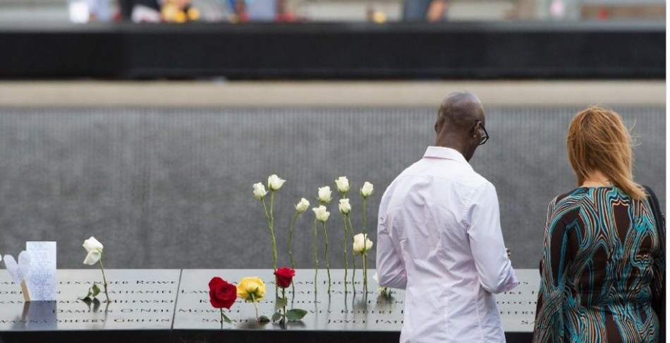 People look over the north memorial pool during the 15th anniversary of September 11 at the 9/11 Memorial and Museum, on September 11, 2016 in New York (AFP Photo/Bryan R. Smith)
