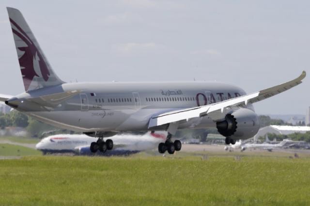 A Qatar Airways Boeing 787 Dreamliner lands at Le Bourget airport near Paris, June 16, 2013. REUTERS/PASCAL ROSSIGNOL