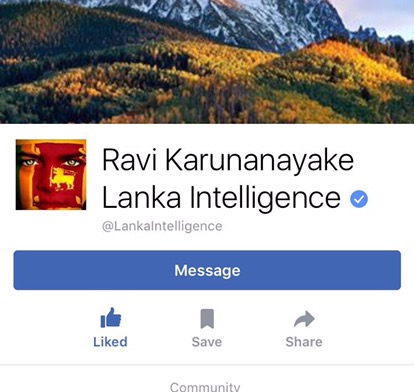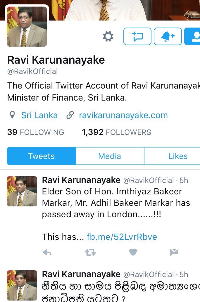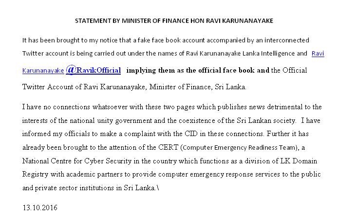 Finance Minister Ravi Karunanayake complains to CID about a Facebook & Twitter fake account representing him, FB page has verified badge.