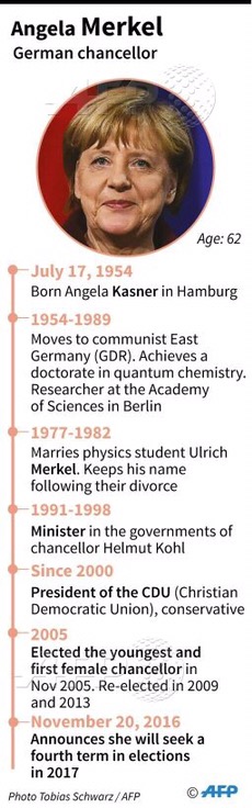 Merkel is the first woman, the youngest person and the only candidate who grew up in communist East Germany to lead the reunited country.