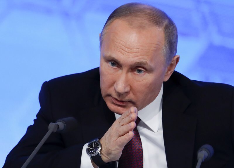 Russian President Vladimir Putin gestures as he speaks during his annual news conference in Moscow, Russia, Friday, Dec. 23, 2016. (AP Photo/Pavel Golovkin)