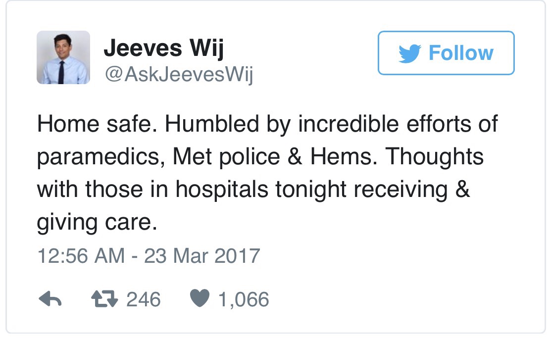 “Home safe! Humbled by the incredible efforts of the paramedics, the Metropolitan Police and the London Helicopter Emergency Medical Service. Thoughts with those in hospitals tonight, receiving and giving care”, Dr Wijesuriya tweeted.