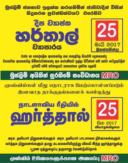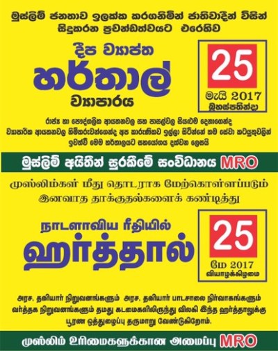 12pm Muslim Rights Organization has called for island wide hartal on Thursday (25) to condemn the continued attacks against Muslims where several shops have been burnt over last few days.