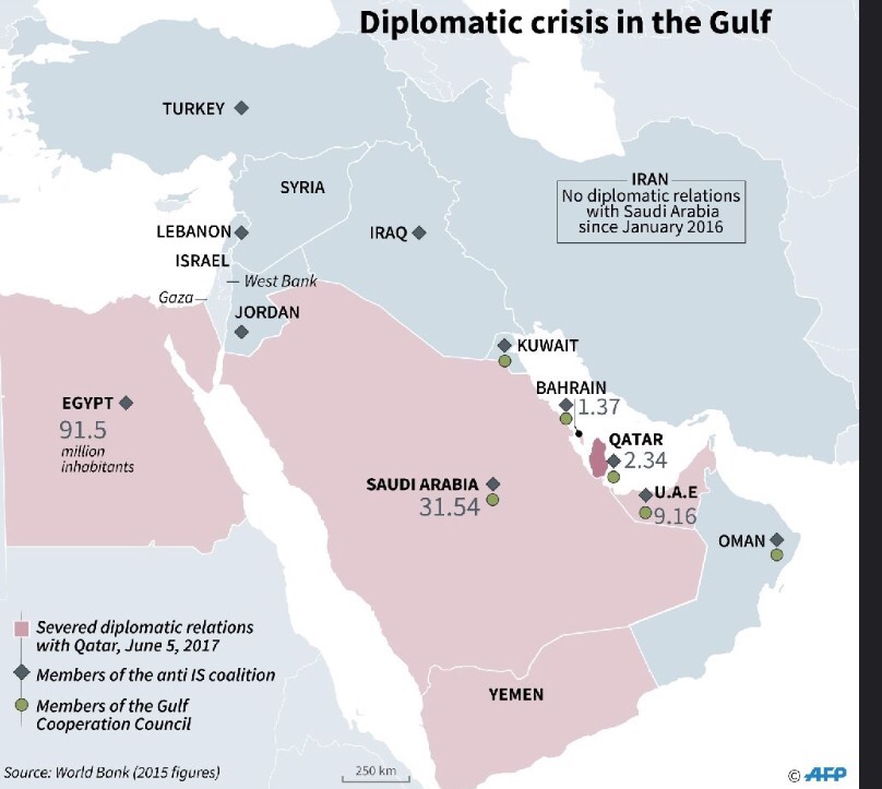 On Monday, Saudi Arabia, Bahrain, Egypt, the United Arab Emirates, Yemen and the Maldives severed ties with Qatar, accusing it of backing terrorism, and imposed punitive measures.