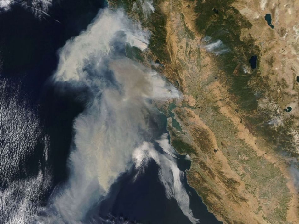 An image acquired by the Moderate Resolution Imaging Spectroradiometer (MODIS) instrument on NASA’s Terra satellite shows smoke billowing from the fires in northern California, Oct. 9, 2017.