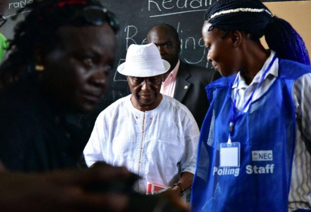 Liberian Vice President and presidential candidate Joseph Boakai (C) attends to cast his vote at a polling station in Monrovia during presidential elections on October 10, 2017 (AFP Photo/ISSOUF SANOGO)
