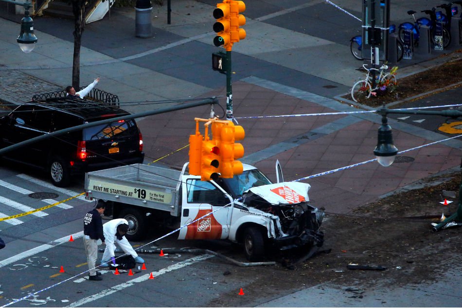 NEW YORK (Reuters) – A man driving a rented pickup truck mowed down pedestrians and cyclists on a bike path alongside the Hudson River in New York City on Tuesday, killing eight people and injuring about a dozen in what authorities said was an act of terrorism.