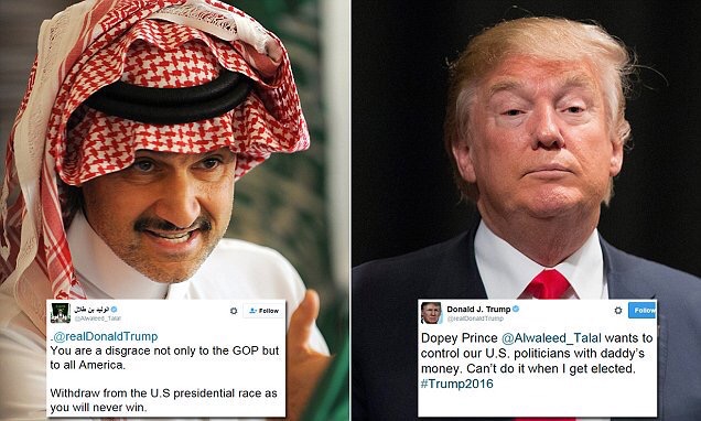 Mr. Trump fired back, also on Twitter, that “Dopey Prince @Alwaleed_Talal wants to control our U.S. politicians with daddy’s money.”