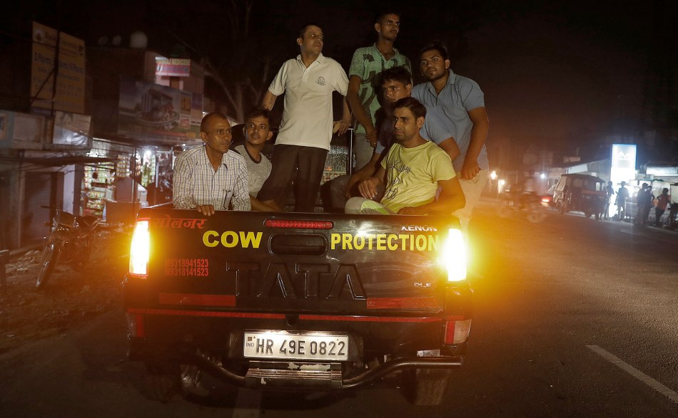SLIDESHOW: A member of the Bhartiya Gau Raksha Dal cow vigilante group raises his arms to stop a truck at a roadblock set up in the northern Indian city of Chandigarh in early July. REUTERS/Cathal McNaughton