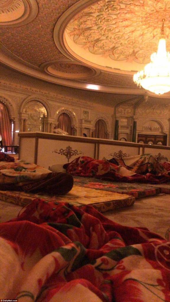 The men are seen gathered together at the Ritz Carlton Hotel in Riyadh, the Saudi capital, inside one of its glittering function rooms – wrapped in blankets and sleeping on thin mattresses.