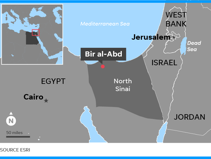 The attack started midday during Friday Prayers when a bomb — probably set off by a suicide bomber, security officials said — ripped through Al Rawda mosque in Bir al-Abed, 125 miles northeast of Cairo. As worshipers fled, they were confronted by masked gunmen who, witnesses said, had pulled up outside in several four-wheel-drive vehicles.