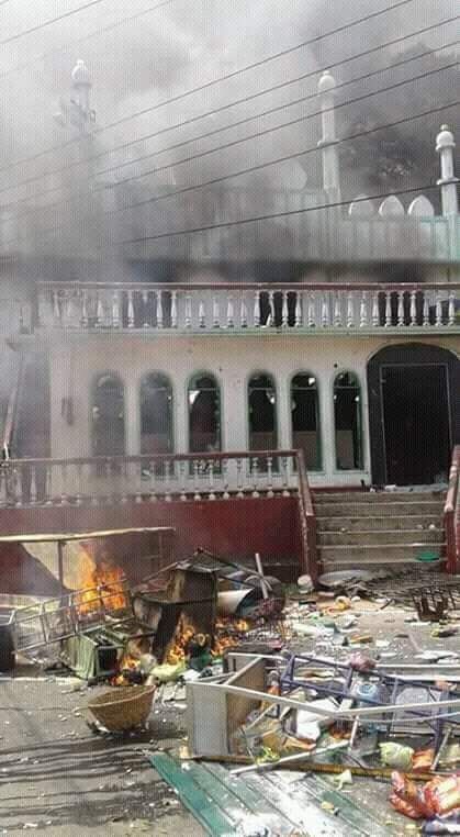 About 10 minutes after the incident near the Noor Jummah mosque shown in the CCTV footage, the mob returned via a back road, out of the line of sight of the mosque’s exterior cameras, and threw a petrol bomb into the mosque’s first floor office, according to witnesses Mohamed Niyaskhan, who said he was beaten and left bloodied, and the mosque secretary M.I.M Shukry.