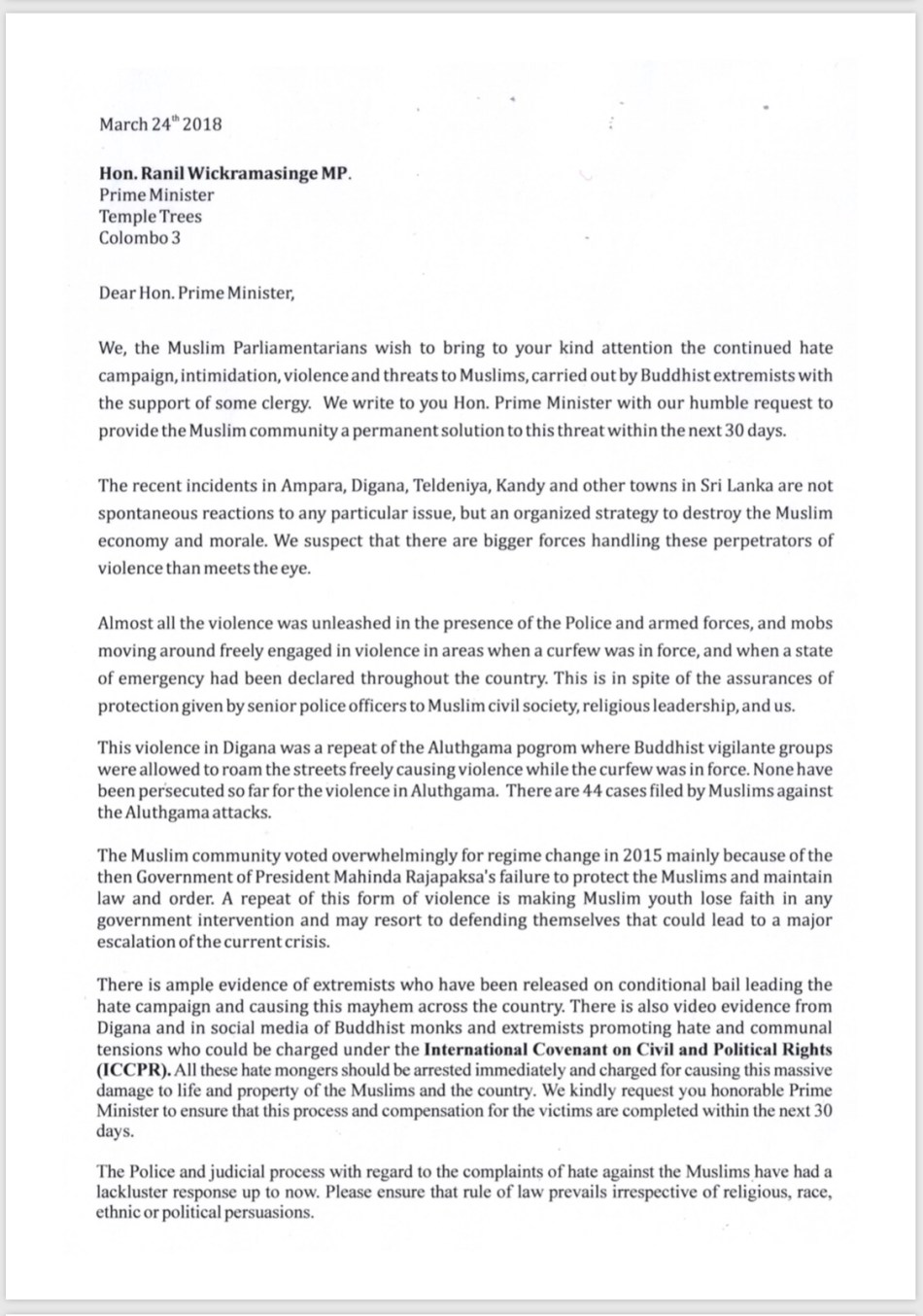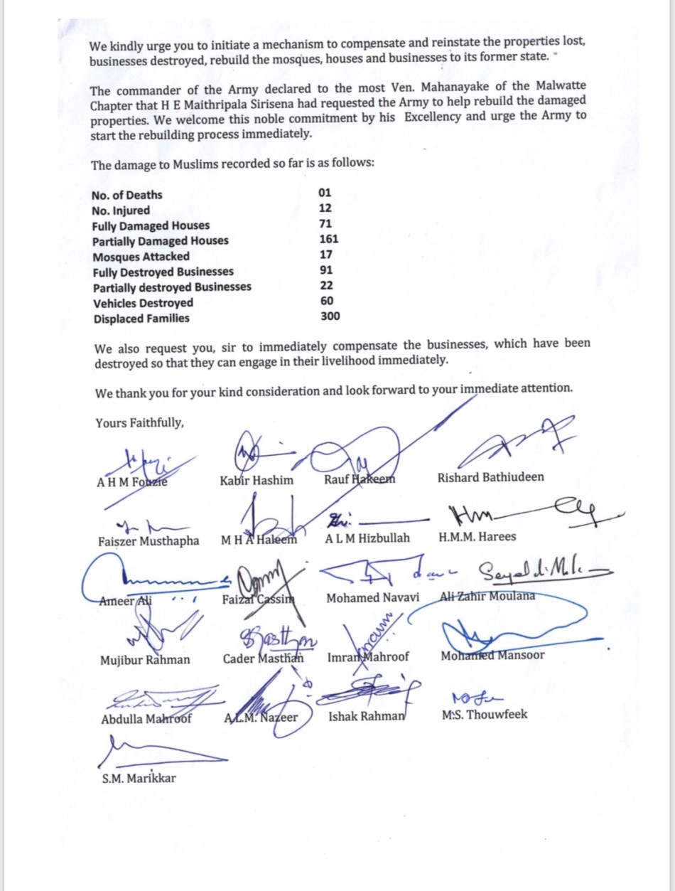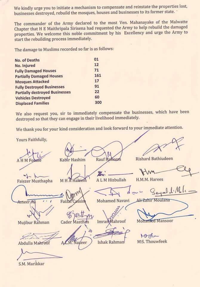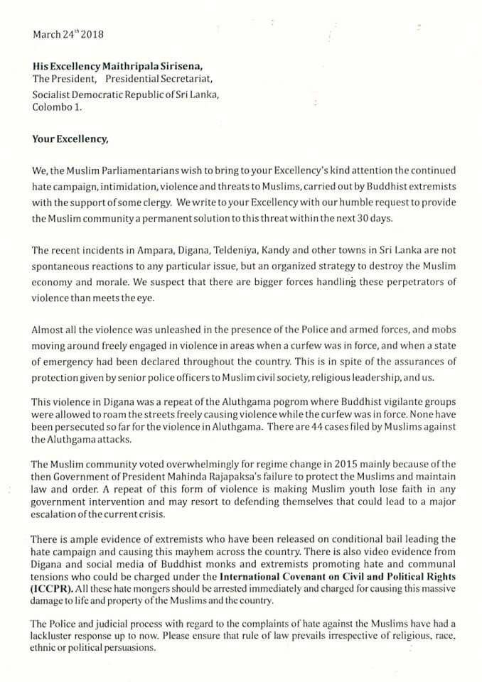 The Muslim Ministers and MPs have written to President Maithripala Siresena and Prime Minister Ranil Wickremesinghe to request immediate intervention to stop the harassment of Muslims in different parts of the country.