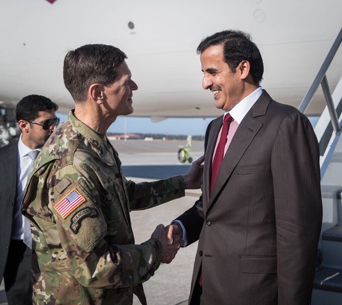 Upon arrival at MacDill Air Force Base , HH the Emir and the accompanying delegation were greeted by HE Commander of the US Central Command General Joseph Votel, HE Qatar’s Ambassador to the United States Sheikh Meshal bin Hamad Al-Thani, as well as a number of senior officers of the US Central Command, and members of the military attache at the Qatari Embassy.