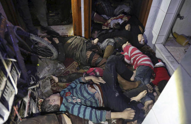 EDS NOTE: GRAPHIC CONTENT – This image released early Sunday, April 8, 2018 by the Syrian Civil Defense White Helmets, shows victims of an alleged chemical weapons attack collapsed on the floor of a building in the rebel-held town of Douma, near Damascus, Syria. Syrian rescuers and medics say a poison gas attack on Douma has killed at least 40 people. The Syrian government denied the allegations, which could not be independently verified. The alleged attack in the town of Douma occurred Saturday night amid a resumed offensive by Syrian government forces after the collapse of a truce. (Syrian Civil Defense White Helmets via AP)