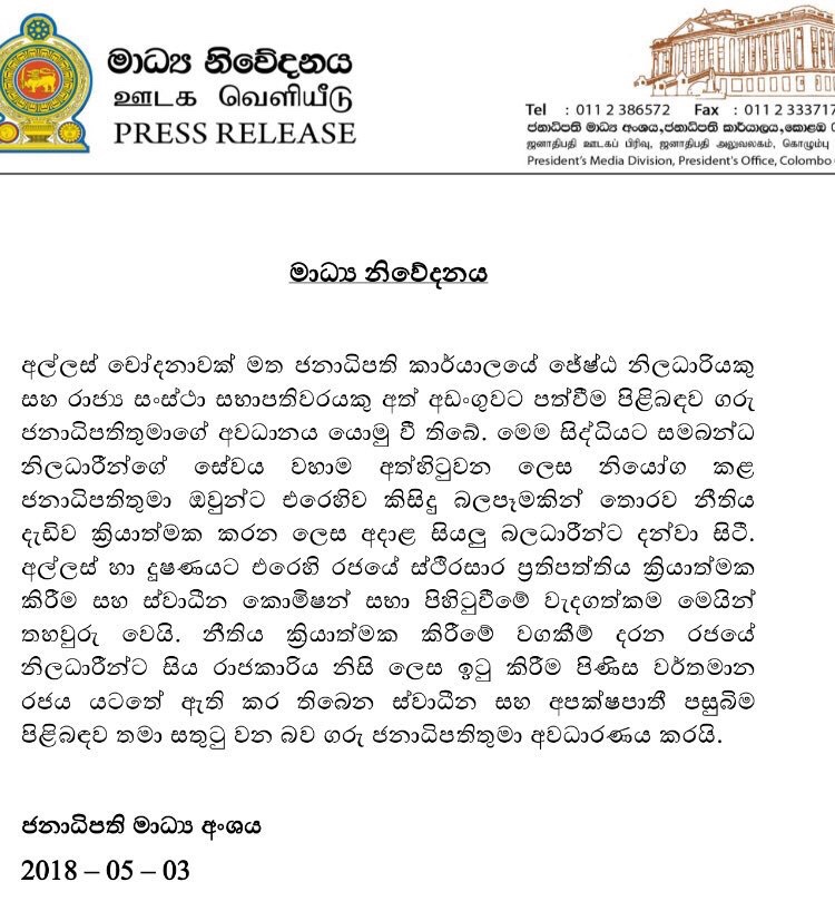 The governing coalition of the Sri Lanka Freedom Party (SLFP) led by Sirisena and the United National Party (UNP) of Prime Minister Ranil Wickremesinghe lost local government polls in February partly due to failure to fulfil promises to punish corrupt politicians and officials.