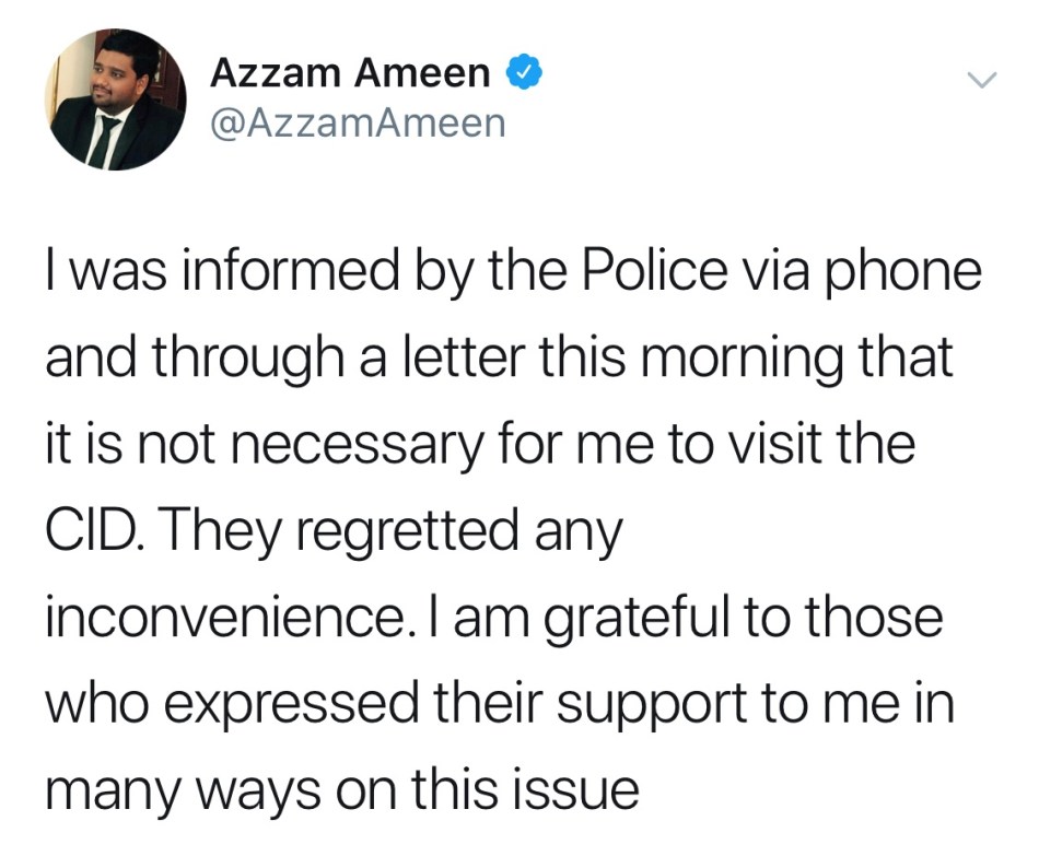 Ameen stated on social media that he was informed by the Police by phone as well in writing this morning that CID cancelled the probe and thanking the support he received by well wishers.