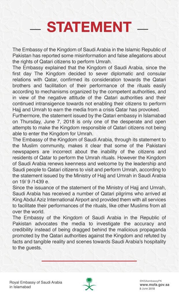 Saudi Arabia then dismissed Qatar’s allegations that its citizens were made to suffer difficulties as they went to perform Umrah, issuing a statement through Saudi Arabia’s embassy in Pakistan released a statement on Thursday correcting false reports circulated in local Pakistani media about Qatari nationals being barred from performing Umrah in the Kingdom of Saudi Arabia.