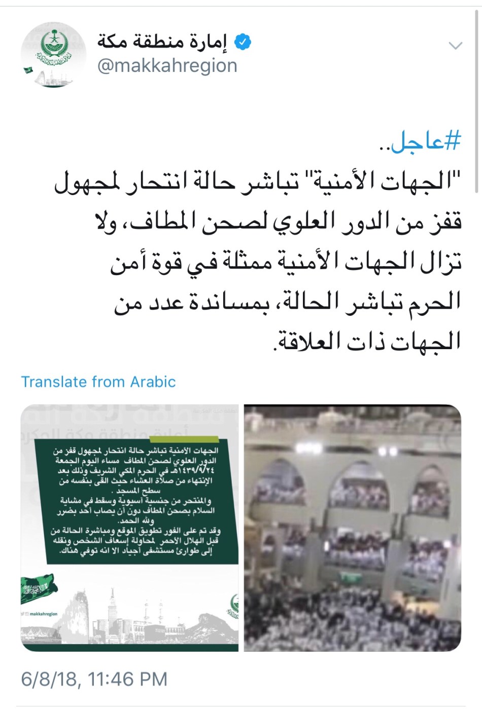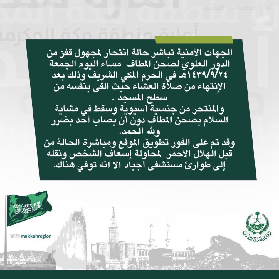 Security authorities have initiated investigations into suicide of middle aged man who jumped from the upper floor of the Grand mosque in Makkah Saudi Arabia late Friday evening.