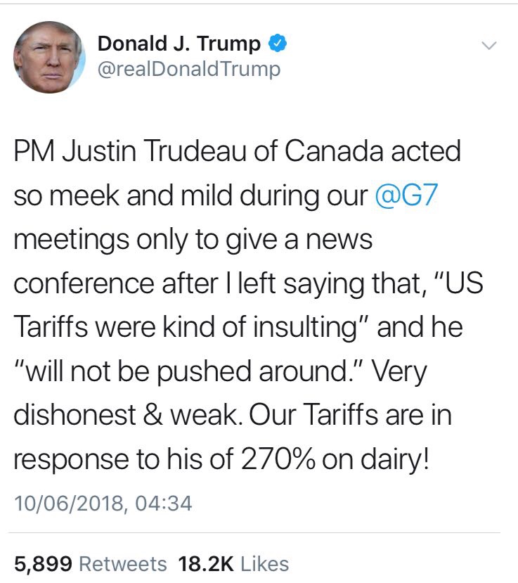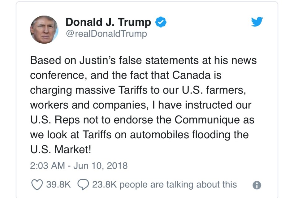 Trump began by contradicting Trudeau’s announcement earlier Saturday that G7 countries had agreed to an “ambitious” joint communique, tweeting that Trudeau’s “false statements” at his press conference prompted him to instruct U.S. officials “not to endorse the Communique as we look at Tariffs on automobiles flooding the U.S. Market!”