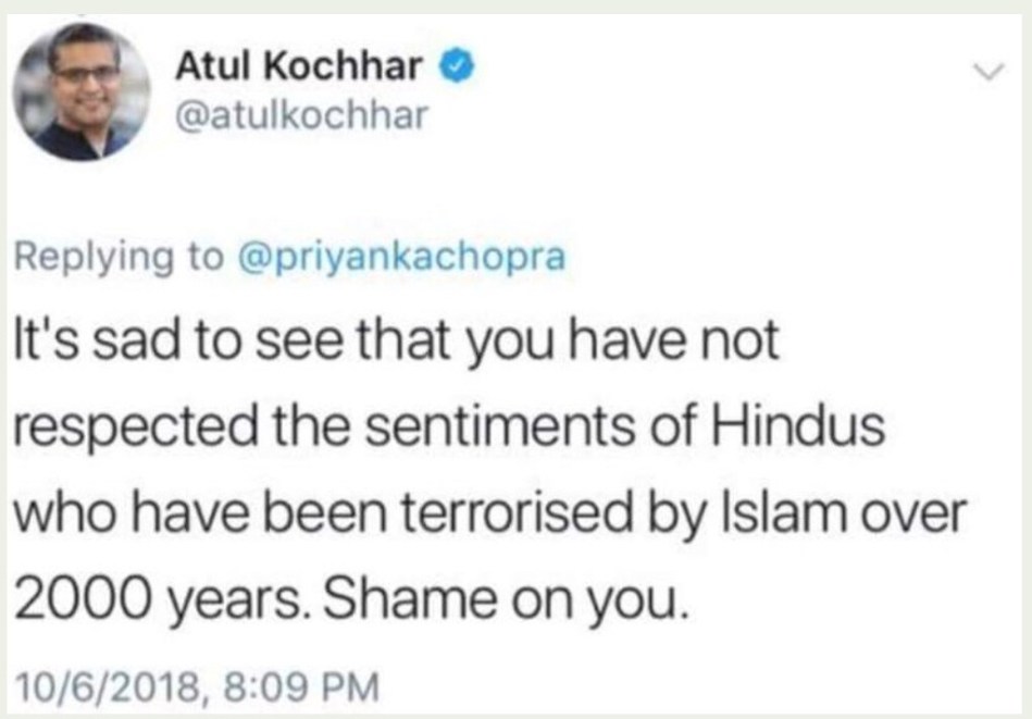 The row erupted after he posted a now-deleted message on Twitter on Sunday night in response to a post by Indian actress Priyanka Chopra, in which she said she was sorry that some people had been offended by the portrayal of Hindu nationalists as terrorists on her US TV show, “Quantico”.