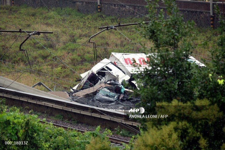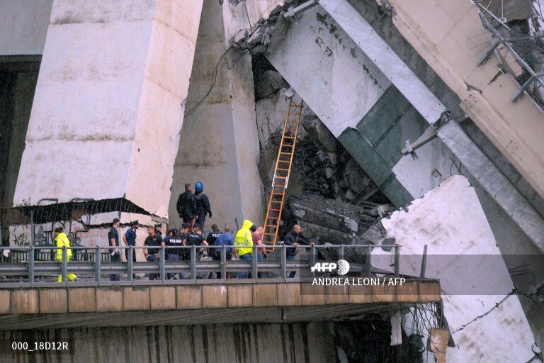A fire service spokesperson told AFP that the bridge had mostly fallen on rail tracks 100 metres below and that cars and trucks had fallen with the rubble.