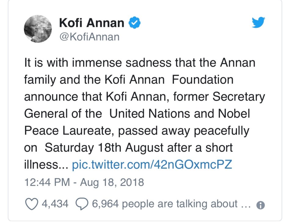Annan’s foundation issued a statement on his Twitter account on Saturday morning that described him as a “global statesman and deeply committed internationalist who fought throughout his life for a fairer and more peaceful world”.