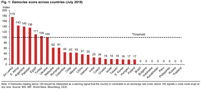 “This is an important result,” they wrote in a note Monday. “As investors focus more on EM risk it is important not to lump all EMs together as one homogeneous group; Damocles highlights a long list of countries with very low risk of full-blown crises.”