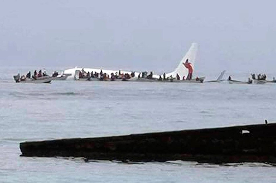 Astonishing pictures show the plane just after it had landed on the water, as locals rushed out on small boats to rescue passengers.