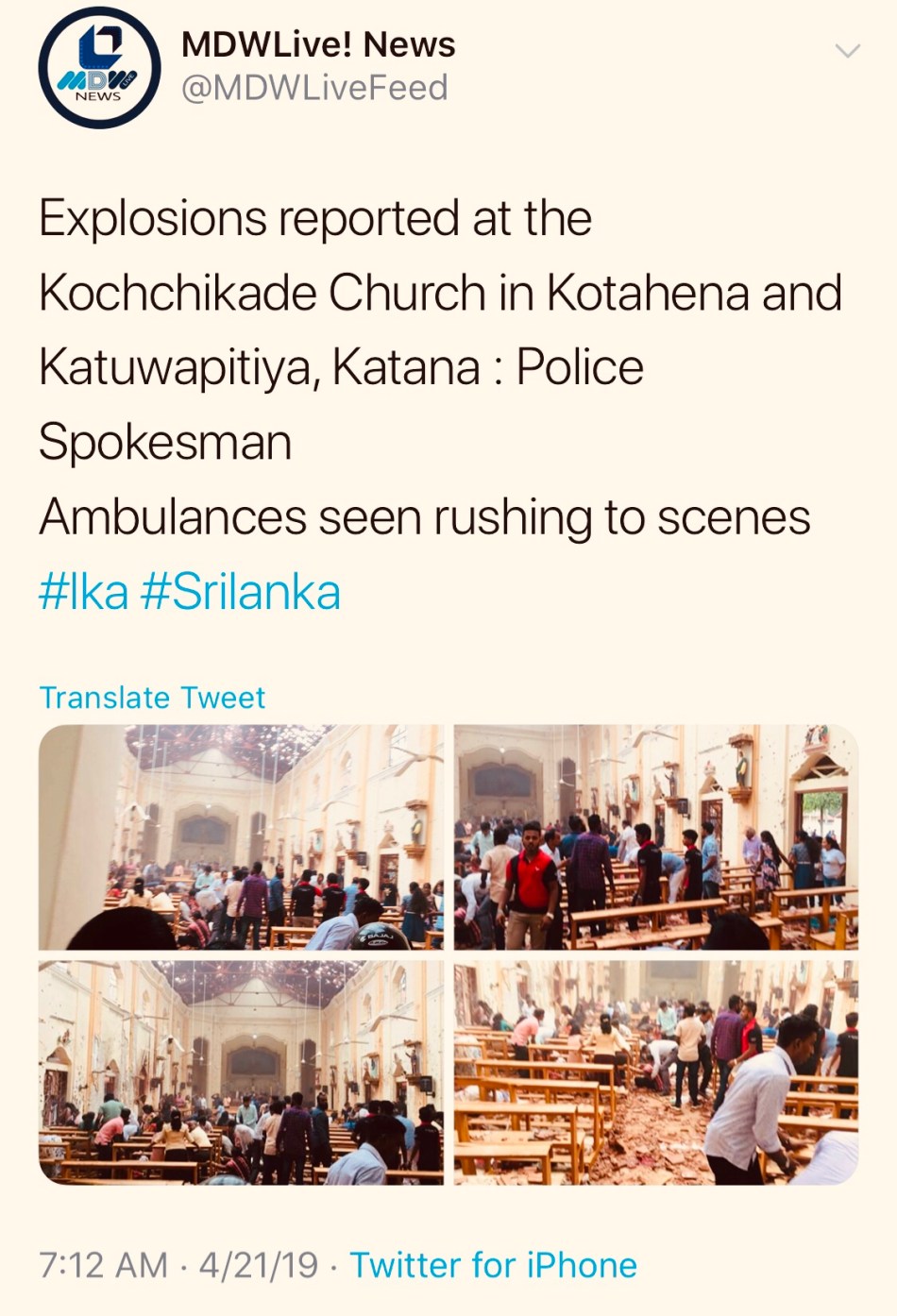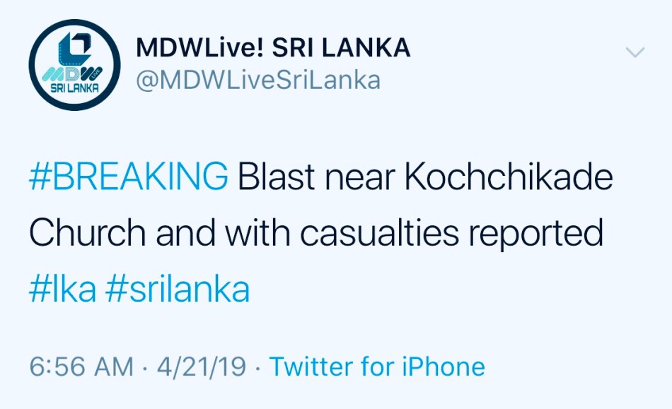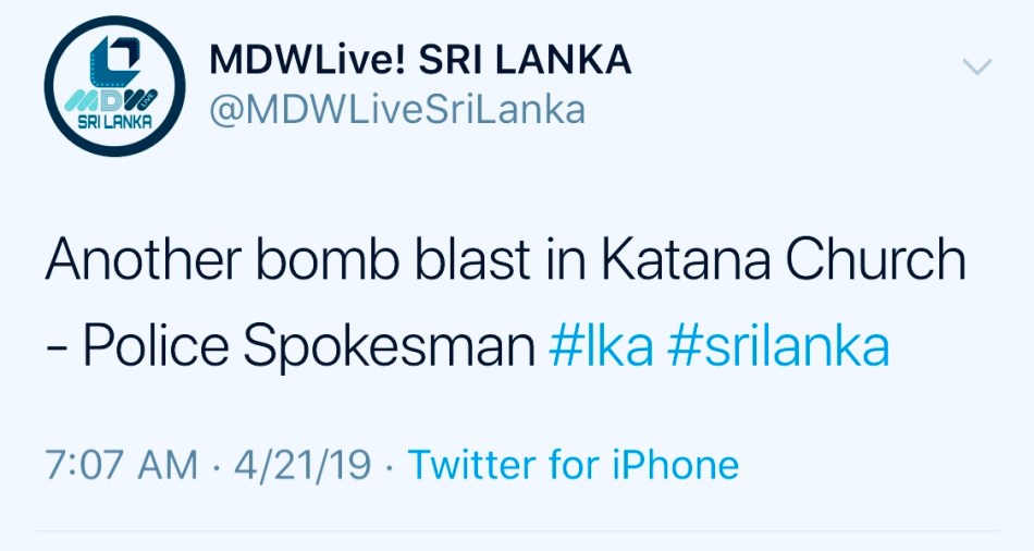 Asia Sri Lanka World News Explosions rock churches and five star hotels in Sri Lanka by MDWLive.netApril 21, 2019 Explosions were reported at St. Anthony’s Church in Kochchikade, Kotahena and St.Sebastian’s Church in Katuwapitiya, Negombo a short while ago, police said. Explosions were also reported outside at least one five-star hotel in Colombo. Share this: Share on WhatsApp (Opens in new window) WhatsApp Share on X (Opens in new window) X Share on Facebook (Opens in new window) Facebook More Email a link to a friend (Opens in new window) Email Like Loading... Post navigation Previous Post Next Post