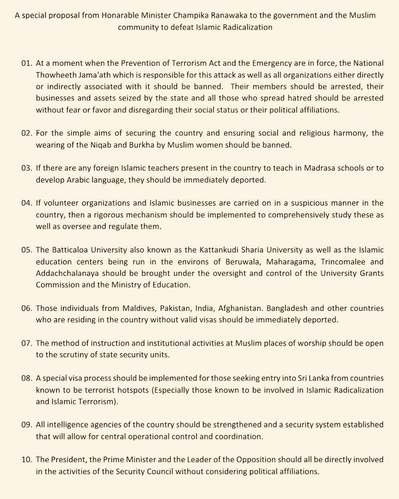 The Minister particularly stressed that the Thawheed Jamat which has been identified as the organization which orchestrated the attacks backed by the ISIS as well as all splinter groups affiliated to it should be proscribed by law as terror outfits.