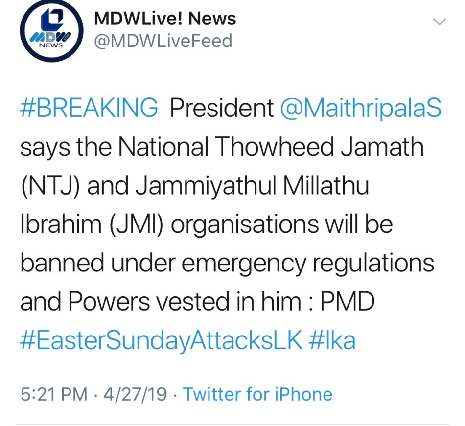 Colombo, April 27 (newsin.asia): Sri Lankan President Maithripala Sirisena has on Saturday banned National Thawheed Jammath (NTJ) and Jamathei Millathu Ibraheem (JMI) in Sri Lanka as per powers vested in him under Emergency Regulations No. 01 of 2019.
