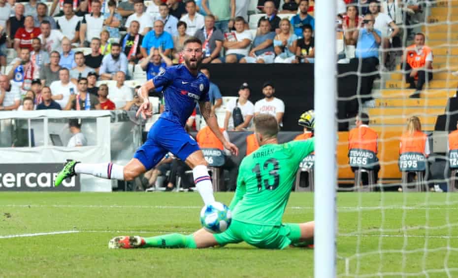 Chelsea were the better team in the first half, and took a deserved lead when Olivier Giroud slid Christian Pulisic’s pass through Adrian’s legs in the 36th minute.