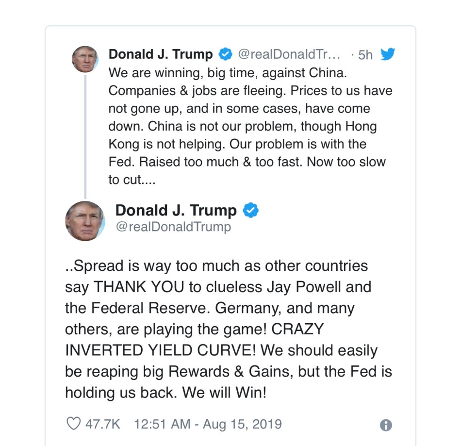President Trump addressed the inverted yield curve on Twitter, blaming the Federal Reserve as “too slow to cut” rates. He called the inverted yield curve “crazy,” expressing his sentiments in all caps.