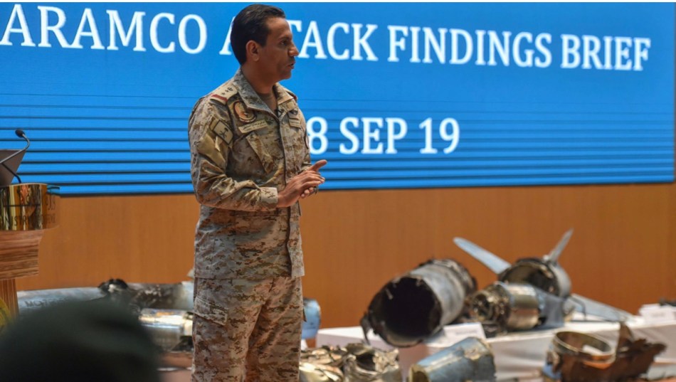 Saudi Colonel Turki bin Saleh al Malki displayed the wreckage of drones and cruise missile had been used in the attack.