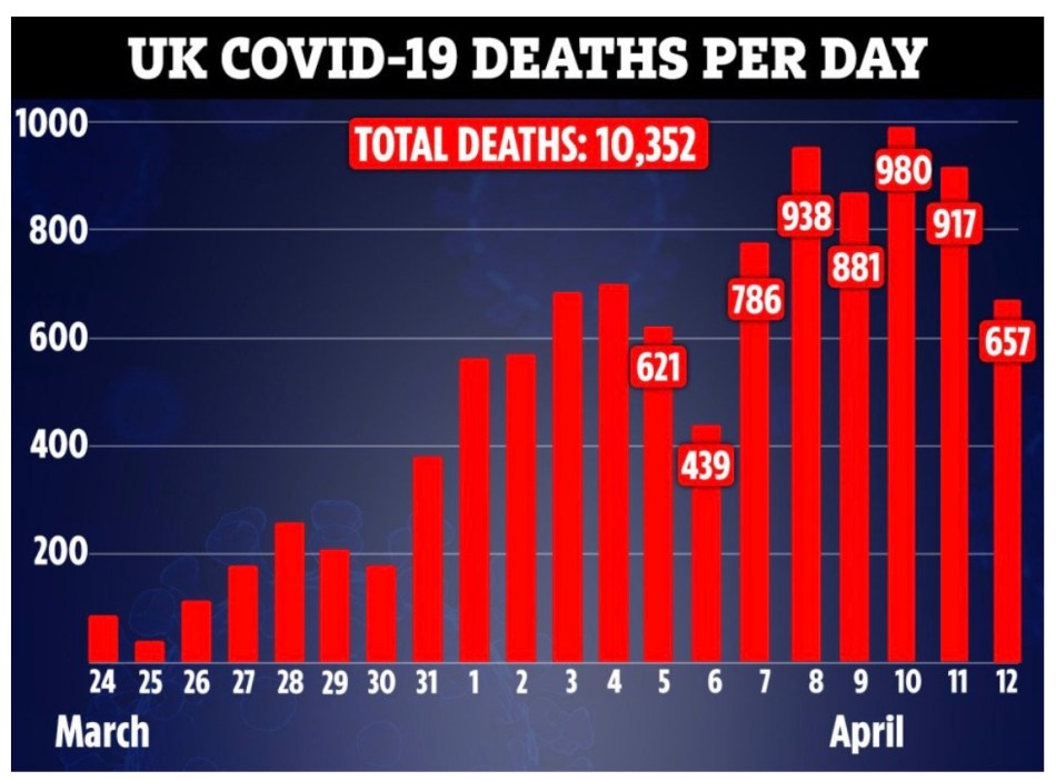 THE coronavirus death toll in the UK has risen to at least 10,352 as 657 die in England alone.