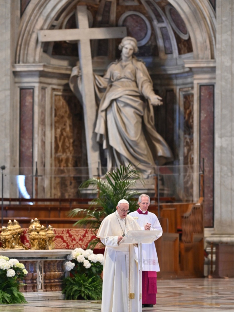 The 83-year-old pontiff spoke to the world’s 1.3 billion Catholics from a hauntingly empty Saint Paul’s Cathedral at a ceremony attended by just a handful of priests and a small choir that was spaced out across the marble floor.