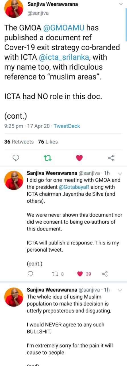 “The GMOA @GMOAMU has published a document ref Cover-19 exit strategy co-branded with ICTA @icta_srilanka, with my name too, with ridiculous reference to “muslim areas”. ICTA had NO role in this doc.” he tweeted.