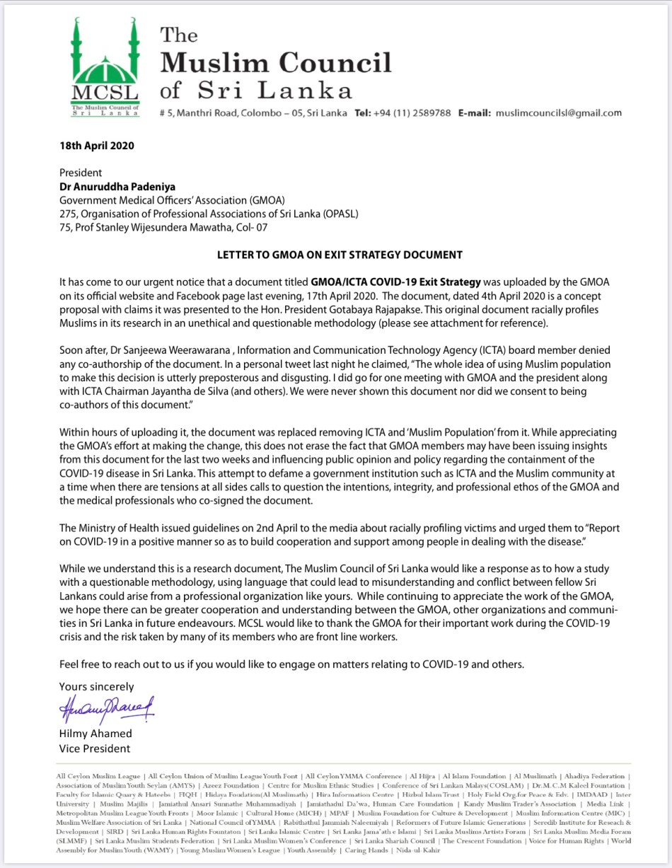 The Muslim Council of Sri Lanka wrote to the GMOA asking for explanations as to how such document was allowed to be published. “Within hours of uploading it, the document was replaced removing ICTA and ‘Muslim Population’ from it. While appreciating the GMOA’s effort at making the change, this does not erase the fact that GMOA members may have been issuing insights from this document for the last two weeks and influencing public opinion and policy regarding the containment of the COVID-19 disease in Sri Lanka. This attempt to defame a government institution such as ICTA and the Muslim community at a time when there are tensions at all sides calls to question the intentions, integrity, and professional ethos of the GMOA and the medical professionals who co-signed the document.”, it wrote.
