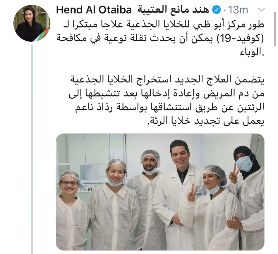 The Abu Dhabi Stem Cells Center (ADSCC) has developed an innovative method which involves extracting stem cells from a patient’s blood and reintroducing them into the lungs via inhalation of a mist, regenerating lung cells and preventing the immune system from overreacting, Hend Al Otaiba tweeted this morning.