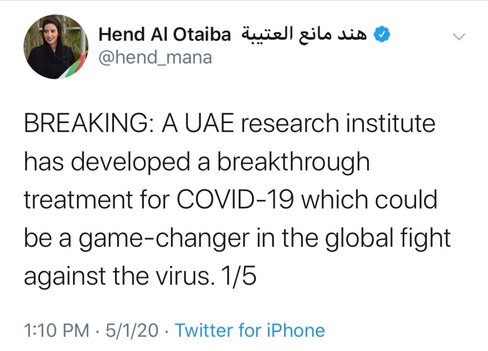 An UAE research institute has developed a breakthrough treatment for COVID-19 which could be a game-changer in the global fight against the virus, according to Hend Al Otaiba, Director of strategic communications at the UAE Ministry of Foreign Affairs and International Co-operation.