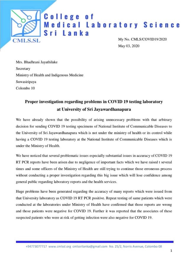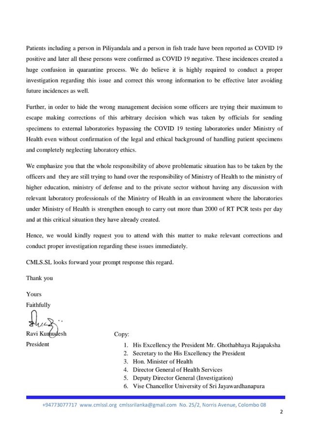 “Further, based on our previous observations we noticed that there are 8 similar erroneous COVID-19 test reports being issued from Sri Jayawardenepura laboratory. Also, recently 4 reports issued by the Colombo University laboratory has now been confirmed to have had errors. A similar 1 report issued by KDU University has also been confirmed to be erroneous. Therefore, so far 13 such erroneous reports have been published to the public. Such reports have now has caused the general public to question on the accuracy of such test reports and the public trust on the lab professionals” he added.