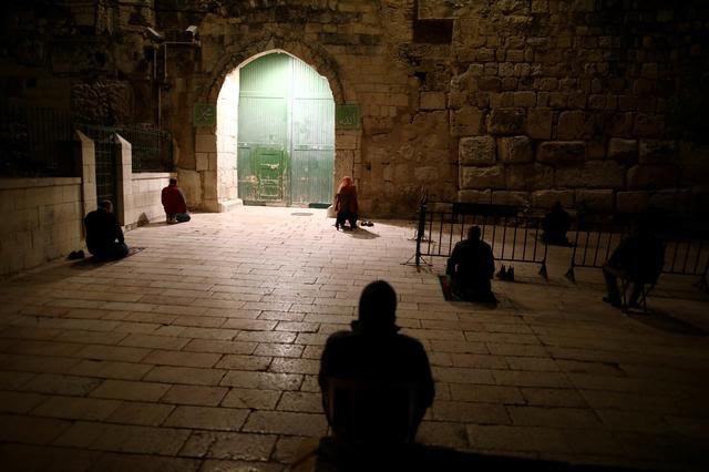 FILE PHOTO: Muslim worshippers pray near the closed gate of the compound housing Al-Aqsa mosque, known to Muslims as Noble Sanctuary and to Jews as Temple Mount in Jerusalem’s Old City, for Ramadan prayers, as mosques were closed due to the coronavirus disease (COVID-19) around the country April 27, 2020. Picture taken April 27, 2020
