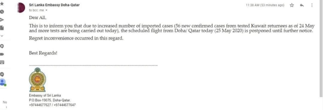 Sri Lankan Embassy in Qatar in an email said that a scheduled flight from Doha to Srilanka was postponed until further notice, due to increased number of imported cases.