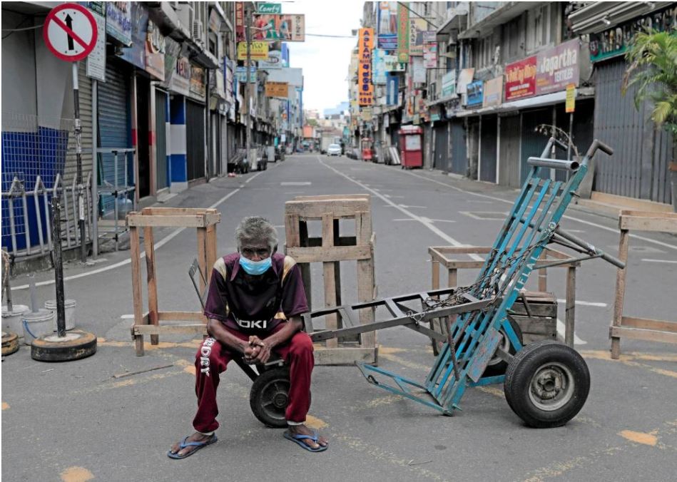 FILE PHOTO: A labourer sits on a cart in a street with closed shops near the main market on labour day, during a curfew amid concerns about the spread of coronavirus disease (COVID-19), in Colombo, Sri Lanka, May 1, 2020. REUTERS/Dinuka Liyanawatte/File Photo