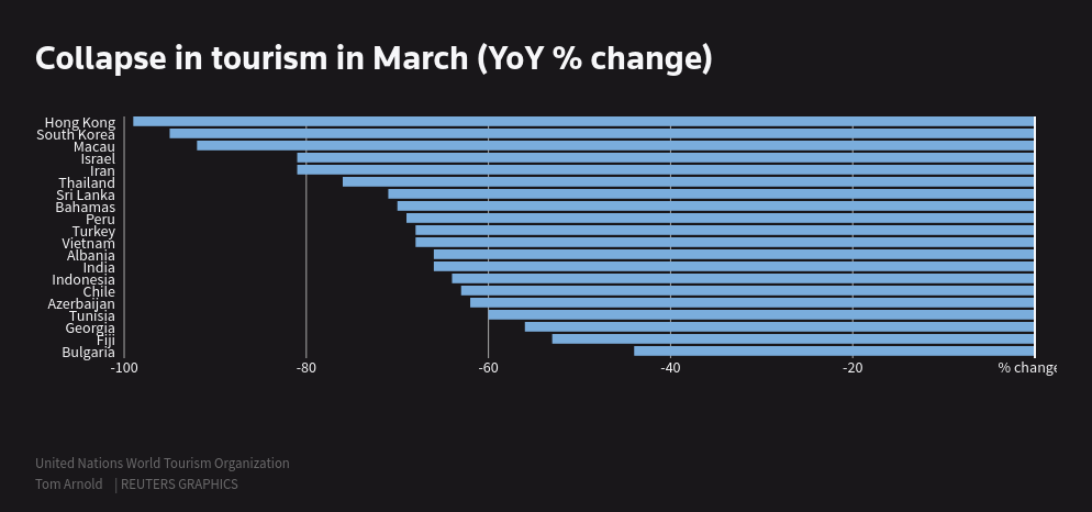 Collapse in tourism in March (YoY % change)
