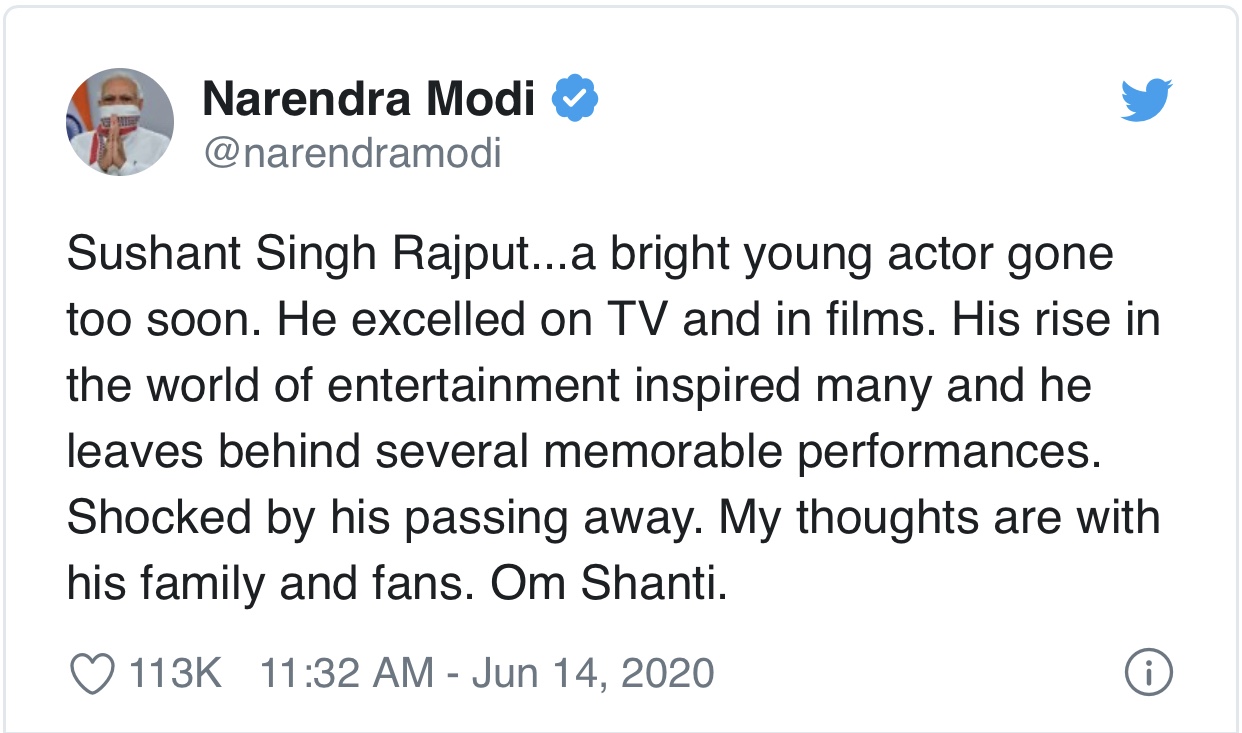 In his condolence message, Prime Minister Narendra Modi said Rajput leaves behind several memorable performances. “Sushant Singh Rajput…a bright young actor gone too soon. He excelled on TV and in films. His rise in the world of entertainment inspired many and he leaves behind several memorable performances. Shocked by his passing away. My thoughts are with his family and fans. Om Shanti,” PM Modi tweeted.