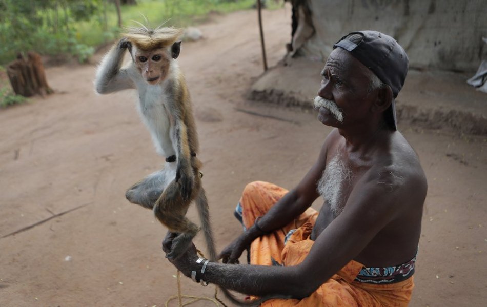 A Sri Lankan Telugu man holds his monkey performing tricks in a colony in Nachchikulama, Sri Lanka, Monday, June 8, 2020. Sri Lanka’s Telugu community, whose nomadic lifestyle has increasingly clashed with the modern world, is facing another threat that could hasten its decline: the COVID-19 pandemic. (AP Photo/Eranga Jayawardena)