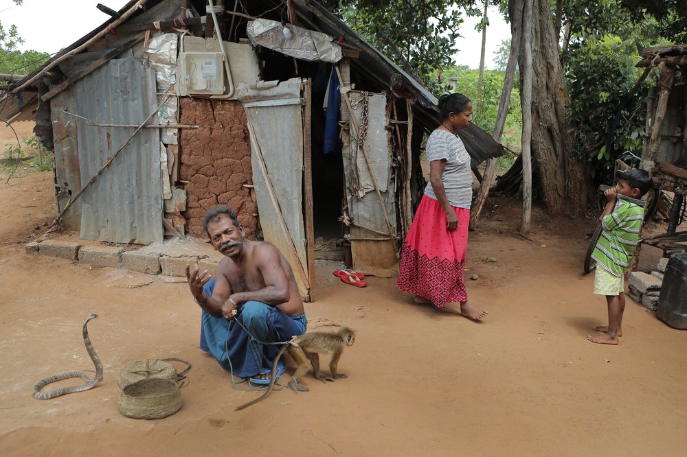 A Sri Lankan Telugu man Muniyandige Thimmanna, left, checks his cobra and monkey Ramesh as his wife Thimmakka Anuwatthuge, background, comes out of a cottage in their colony in Nachchikulama, Sri Lanka, Tuesday, June 9, 2020. Sri Lanka’s Telugu community, whose nomadic lifestyle has increasingly clashed with the modern world, is facing another threat that could hasten its decline: the COVID-19 pandemic. (AP Photo/Eranga Jayawardena)