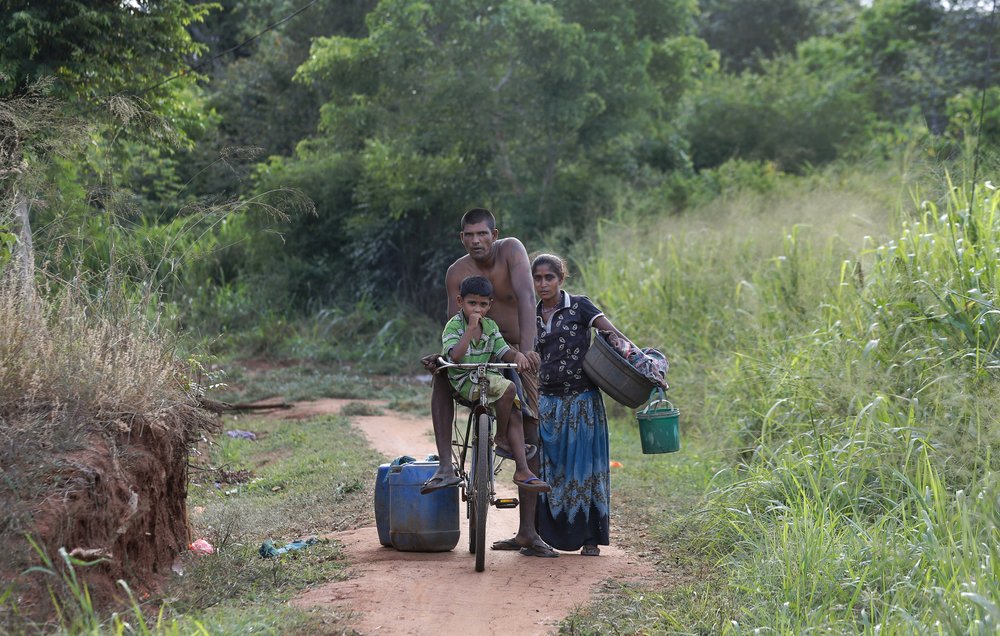 A Sri Lankan Telugu family travels to collect water for their household consumption in Nachchikulama, Sri Lanka, Monday, June 8, 2020. Sri Lanka’s Telugu community, whose nomadic lifestyle has increasingly clashed with the modern world, is facing another threat that could hasten its decline: the COVID-19 pandemic. (AP Photo/Eranga Jayawardena)